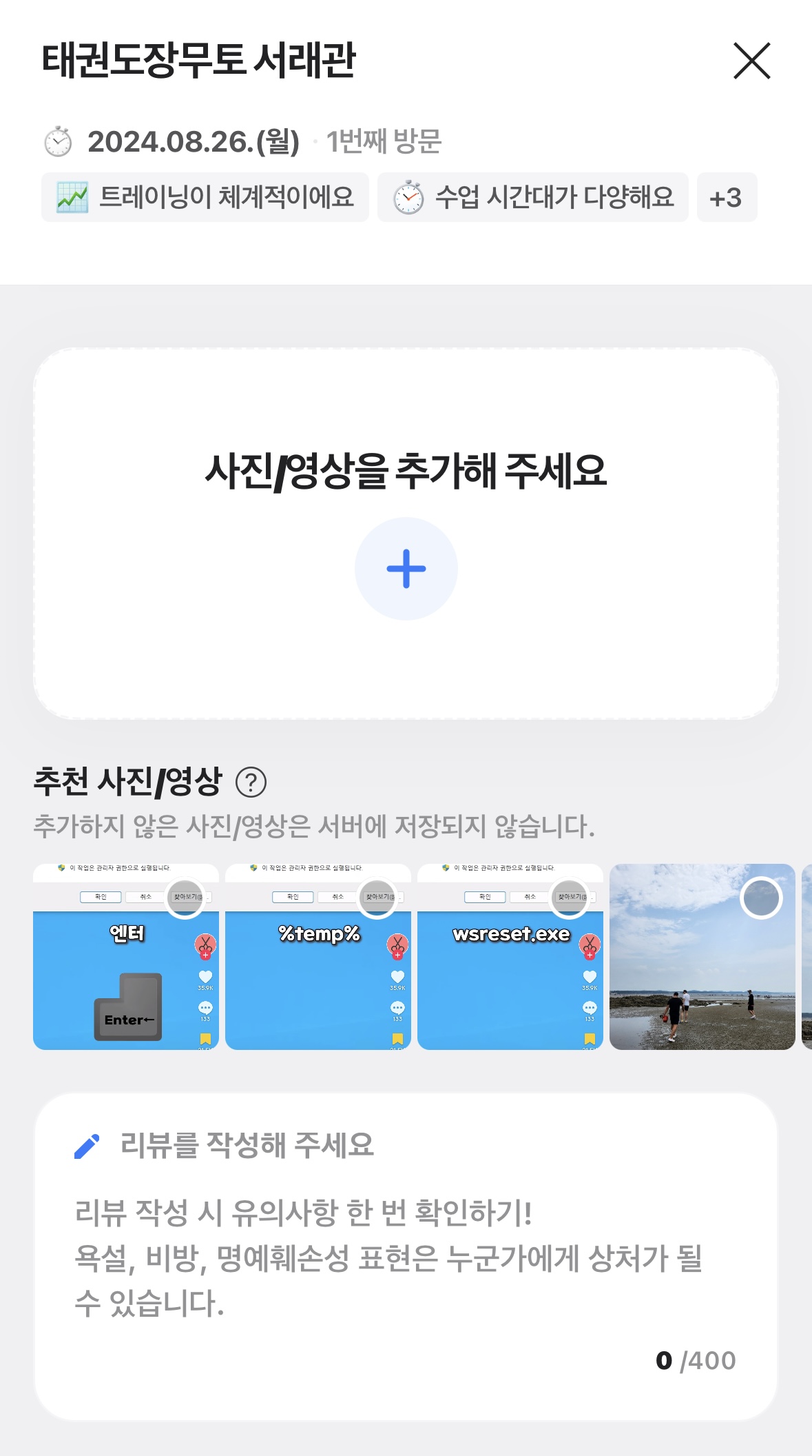 그리고 사진 또는 영상을 추가 해주시고 좋은 리뷰 달아 주시고 관장님께 확인 받으면 ?