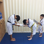 [태권도장 무토] 태권도장에 웃음꽃이 넘치던 날 수련생들이 당당하게 심사를 보고 승급된 띠를 받는 날이에요 이날만큼 신나고 기분이 들뜰 순 없겠죠?? 이날은 내가 주인공!! 우리 도장 3총사 곽준혁, 이율, 이한준 드디어 초록띠를 매게되다!! 서로의 띠를, 자신의 띠를 바라보며 아직은 어색해하네요 기쁜 마음에 활짝 웃어 보이는 아이들 한준이는 벌써 군기가 들었나??ㅋㅋㅋㅋㅋ 태권 전사들 축하합니다. 태윤이가 드디어!!!! 파란띠를 매다니 실력은 이미 파란띠의 모습을 갖추고 있기에 어색하게 않네요 태윤이의 파트너 지민이! 이번 심사는 페스티벌로 2단계 승급이 안되었지만 다음을 기약하며 귀염둥이 김민균 콧구멍이 발랑발랑 하는 걸 보아하니 상당히 들떠있군 미소천사 승윤이도 축하해 유소년 친구들 노력의 결실을 ..